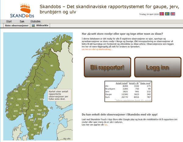 Har du sett store rovdyr eller funnet spor etter noen? Da kan du selv registrere det i Skandobs på nett eller i app.